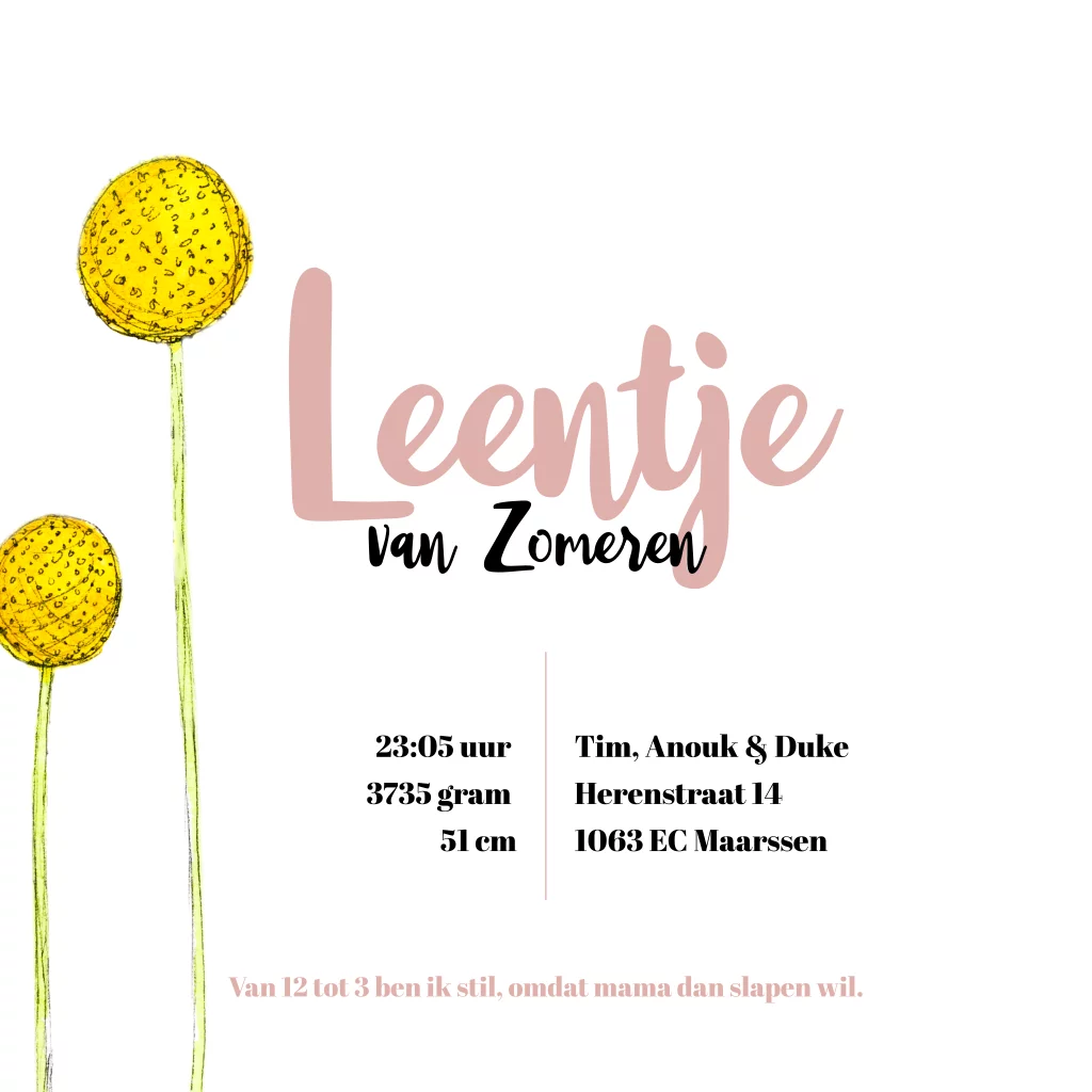 Geboortekaartje meisje met een schattig welpje en mooie bloemen, met de hand getekend en afgewerkt met aquarel. Maak van dit roze geboortekaartje met ronde hoeken, met verschillende kleuren en lettertypes er je eigen geboortekaartje van.