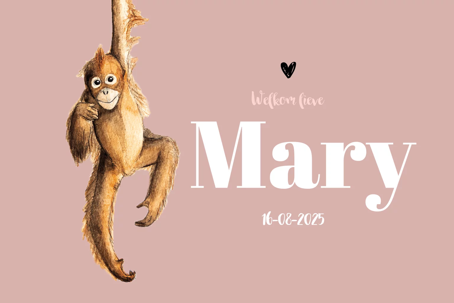 Geboortekaartje meisje roze met een illustratie van een schattige aap getekend door BINTJE. Dit geboortekaartje is helemaal zelf aan te passen.