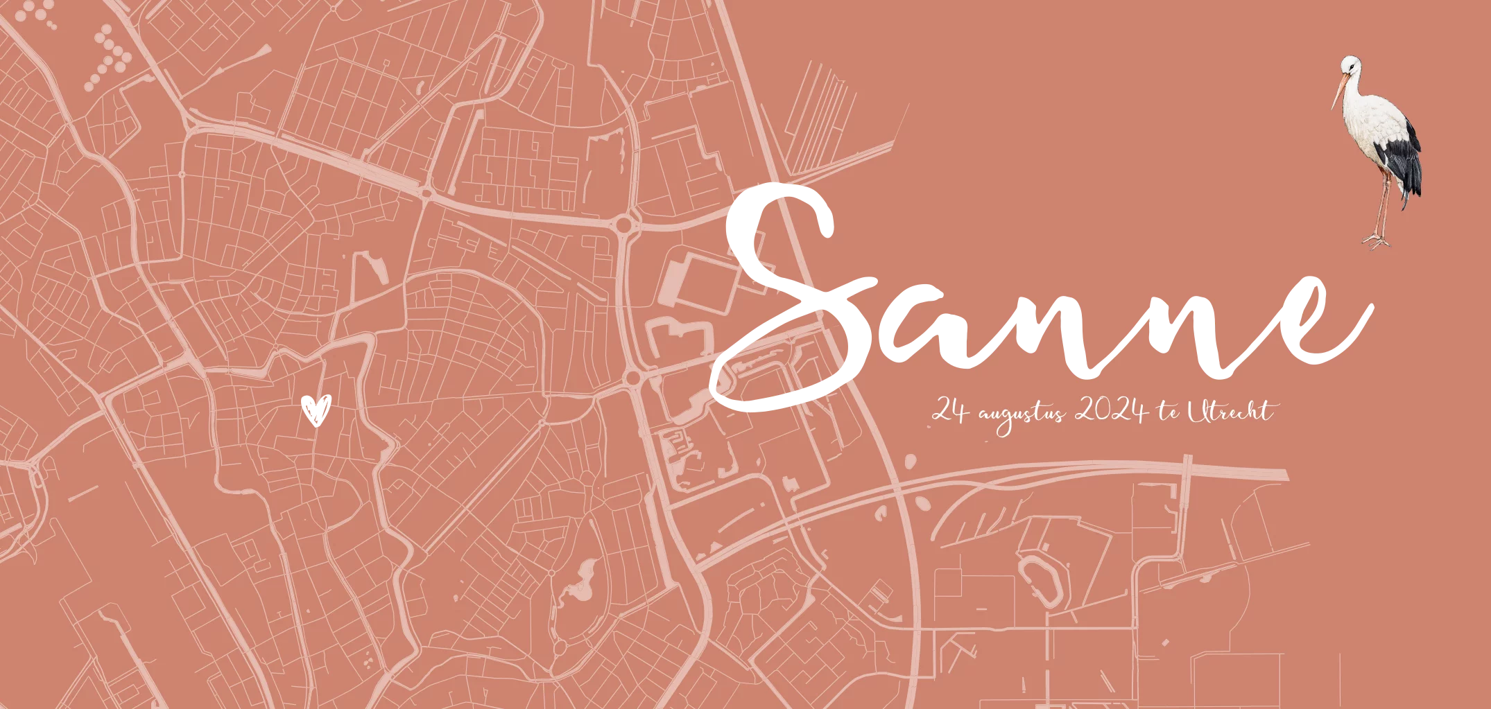 Geboortekaartje meisje met de plattegrond van Utrecht en goudfolie, Op het kaartjes staat een kleine illustratie van een ooievaar getekend door BINTJE. Dit kaartje kan je helemaal zelf aanpassen naar eigen wens. Wil je graag een plattegrond van een andere stad of dorp? Mail voor de mogelijkheden.