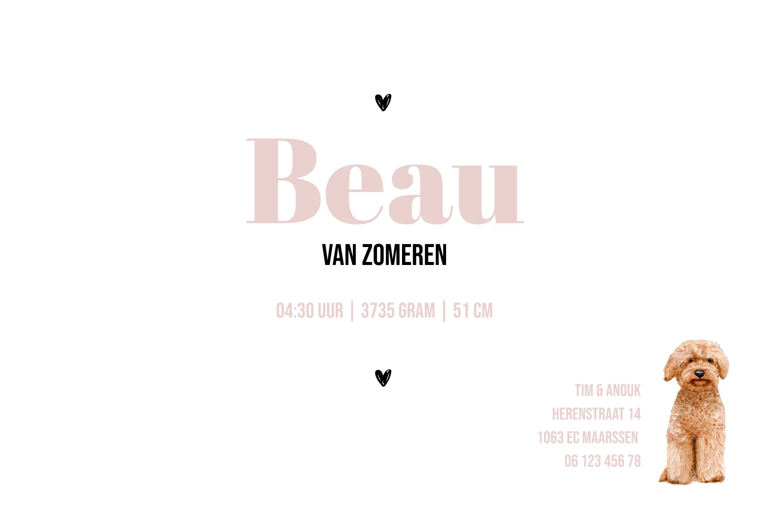 Geboortekaartje met labradoodle en foliedruk voor een meisje. De illustraties zijn met de hand getekend en afgewerkt met aquarel. Maak van dit geboortekaartje, met verschillende kleuren en lettertypes er je eigen geboortekaartje van.