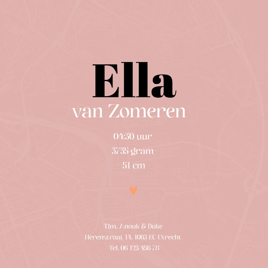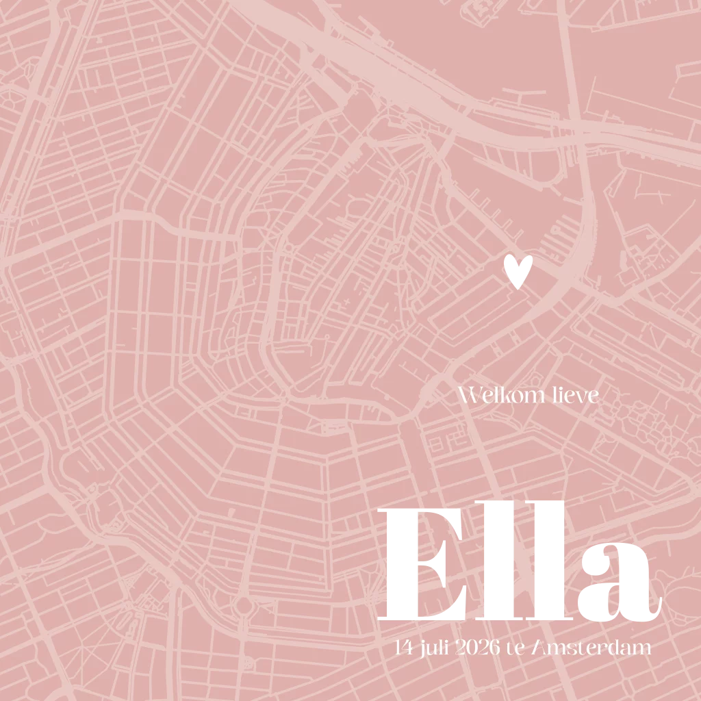 Geboortekaartje meisje met de plattegrond van Amsterdam en Rosegoud folie. Dit kaartje kan je helemaal zelf aanpassen naar eigen wens. Wil je graag een plattegrond van een andere stad of dorp? Mail voor jouw stad.