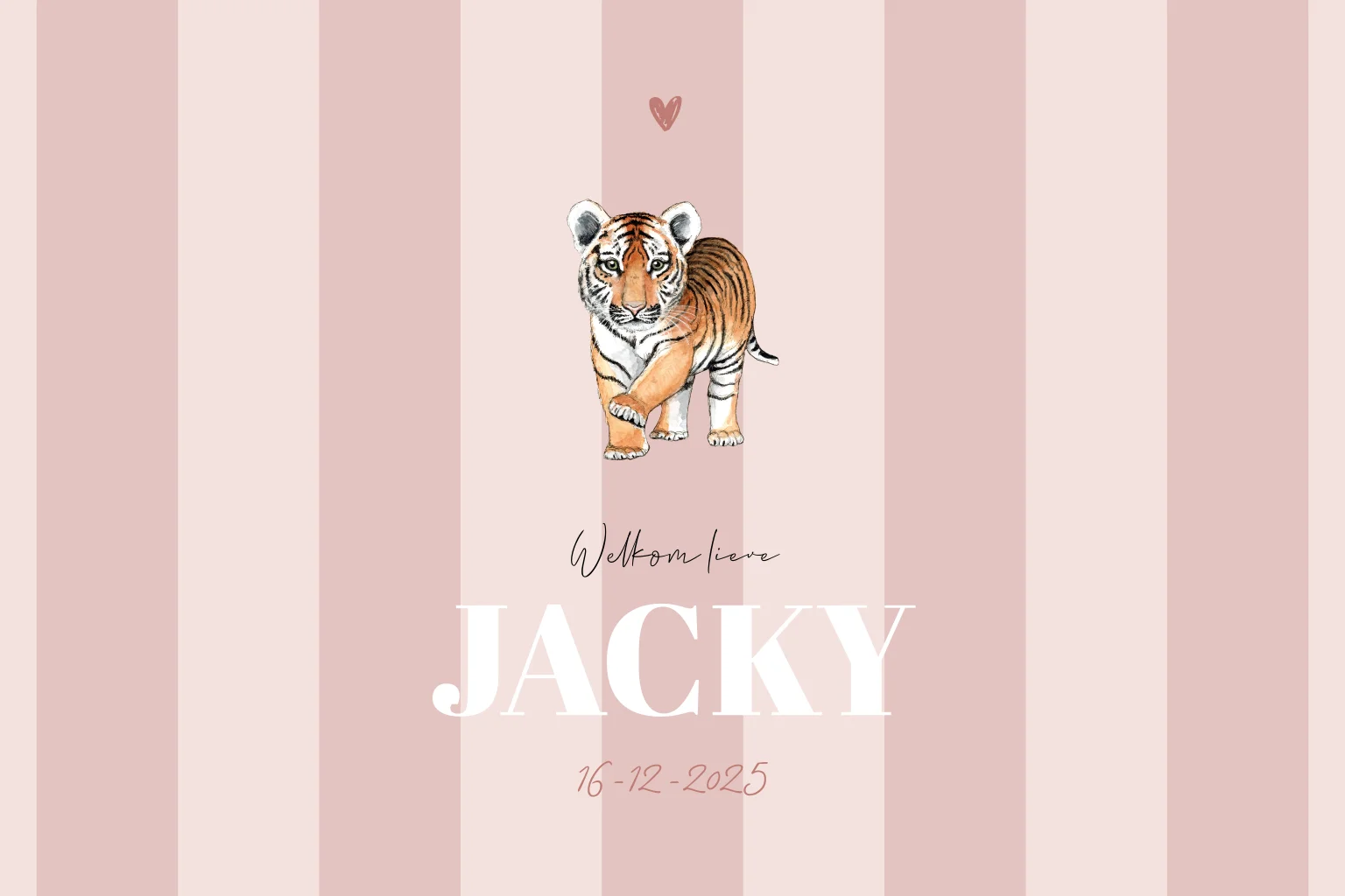 Geboortekaartje meisje strepen en een baby tijger, met de hand getekend en afgewerkt met aquarel. Maak van dit geboortekaartje, met verschillende kleuren en lettertypes er je eigen geboortekaartje van.