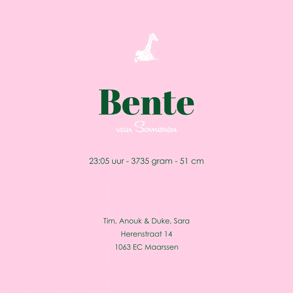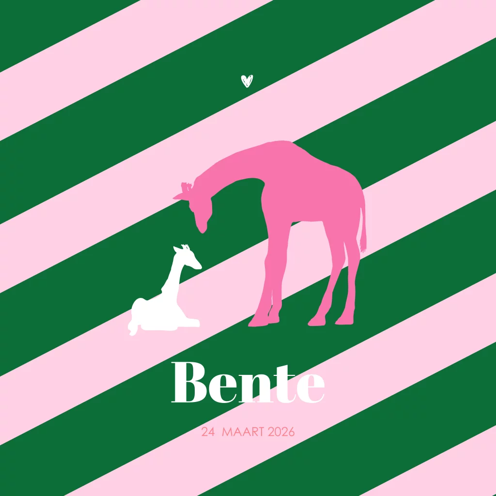 Staand geboortekaartje met colorblocking met een silhouet van een baby giraf met volwassenen. Het geboortekaartje kan je helemaal zelf aanpassen. Maak met andere kleuren, lettertypes of een ander diertje er je eigen geboortekaartje van.