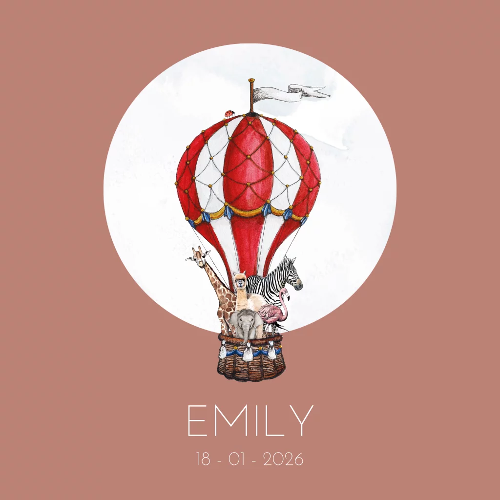 Vierkant geboortekaartje met een illustratie van een luchtballon vol met jungle dieren, getekend door BINTJE. Dit kaartje is helemaal zelf aanpassen in de editor. Maak met andere kleuren, lettertypes of een ander diertje er je eigen geboortekaartje van.