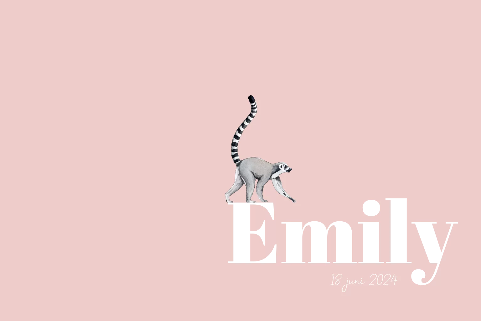 Lief maki, met de hand getekend en afgewerkt met aquarel. Maak van dit geboortekaartje door verschillende kleuren en lettertypes er je eigen ontwerp van.