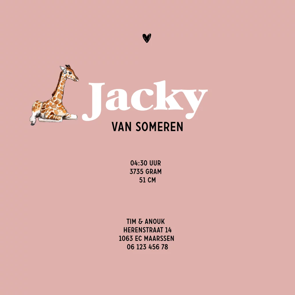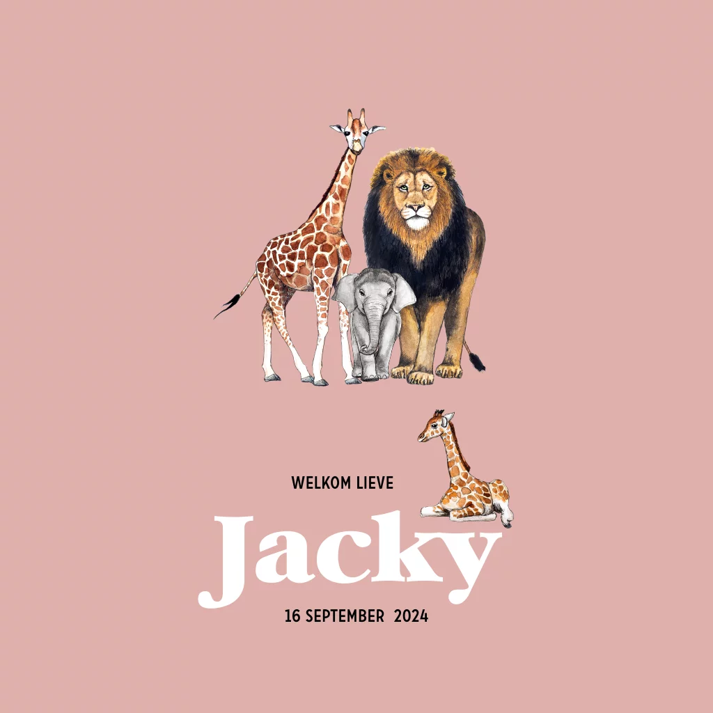 Familie giraffe met leeuw, olifant met de hand getekend en afgewerkt met aquarel. Maak van dit geboortekaartje door verschillende kleuren en lettertypes er je eigen ontwerp van.