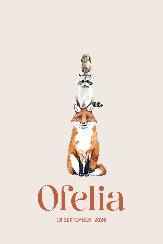 Stapel dieren, met de hand getekend en afgewerkt met aquarel. Maak van dit geboortekaartje door verschillende kleuren en lettertypes er je eigen ontwerp van.