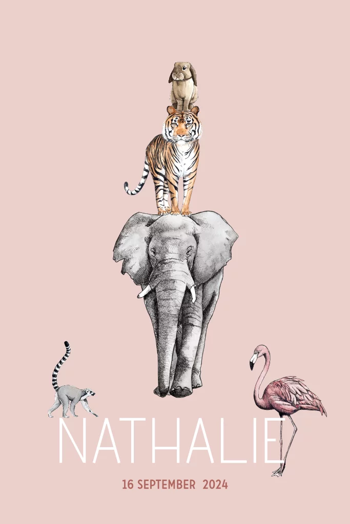 Stapel dieren, met de hand getekend en afgewerkt met aquarel. Maak van dit geboortekaartje door verschillende kleuren en lettertypes er je eigen ontwerp van.