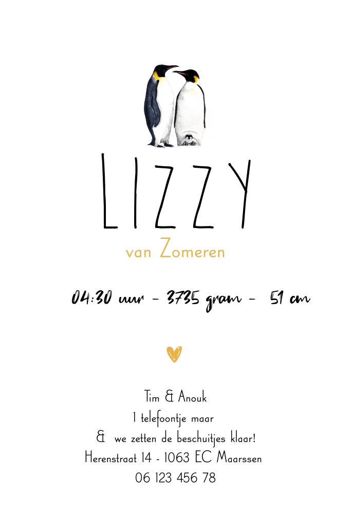 Lief pinguin gezinnetje, met de hand getekend en afgewerkt met aquarel. Maak van dit geboortekaartje door verschillende kleuren en lettertypes er je eigen ontwerp van.