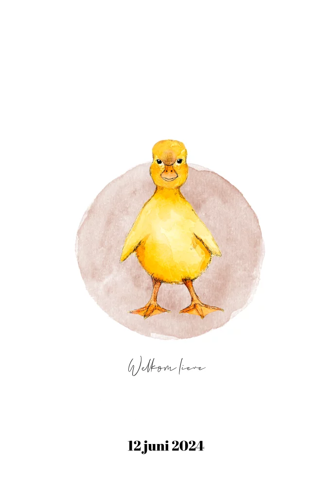 Schattig baby eendje, met de hand getekend en afgewerkt met aquarel. Maak van dit geboortekaartje door verschillende kleuren en lettertypes er je eigen ontwerp van.