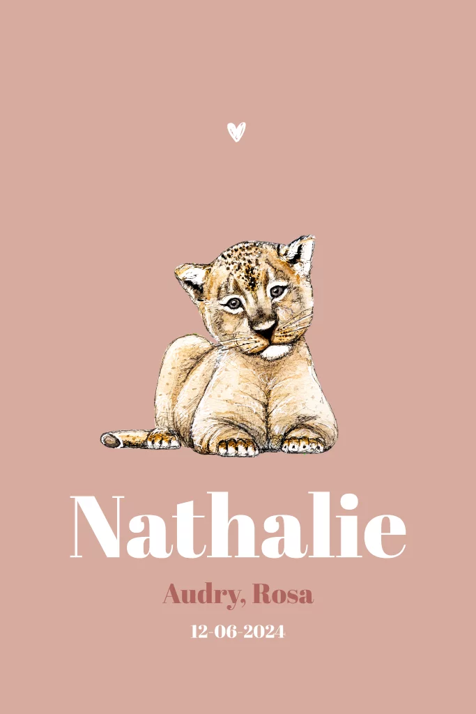Lief baby leeuwtje, met de hand getekend en afgewerkt met aquarel. Maak van dit geboortekaartje door verschillende kleuren en lettertypes er je eigen ontwerp van.