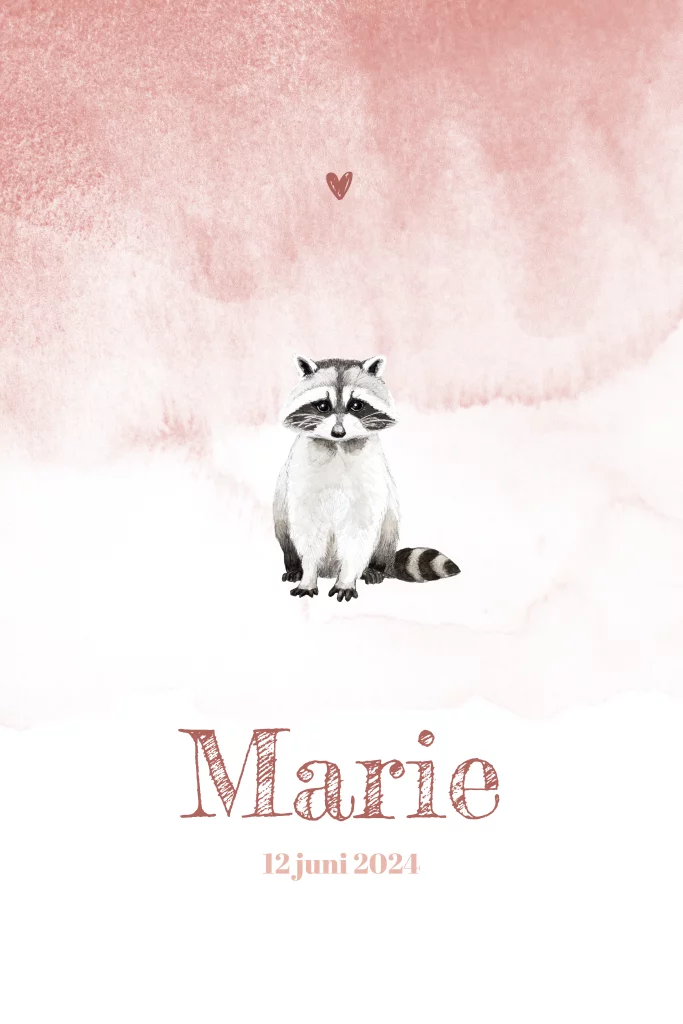 Stoere wasbeer, met de hand getekend en afgewerkt met aquarel. Maak van dit geboortekaartje door verschillende kleuren en lettertypes er je eigen ontwerp van.