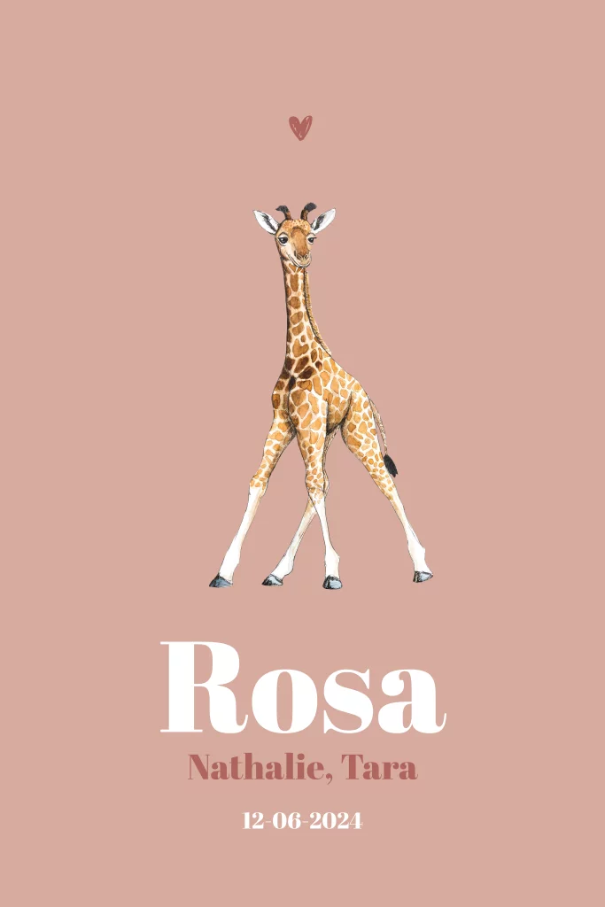 Schattig girafje, met de hand getekend en afgewerkt met aquarel. Maak van dit roze geboortekaartje met giraffe door verschillende kleuren en lettertypes er je eigen ontwerp van.