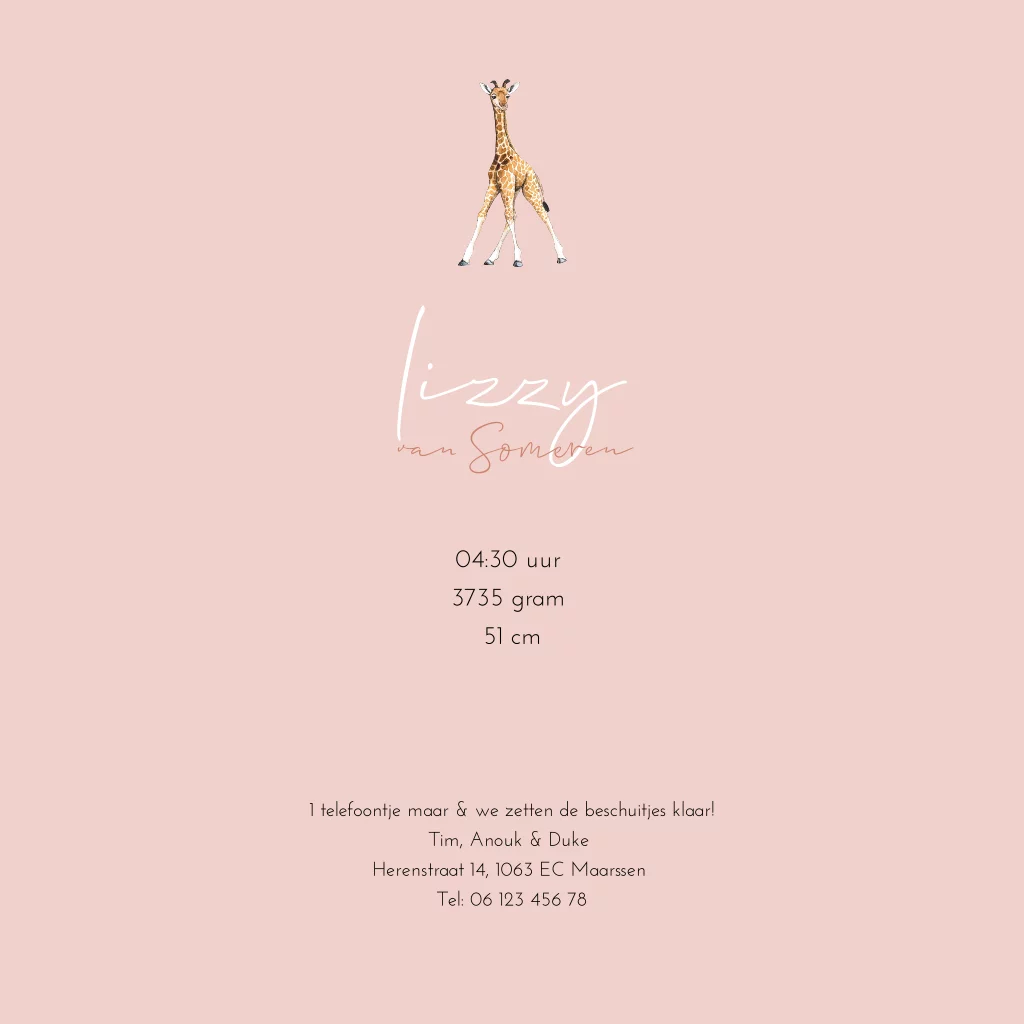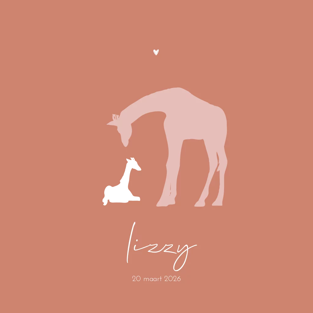 Vierkant geboortekaartje met een silhouet van een baby giraf