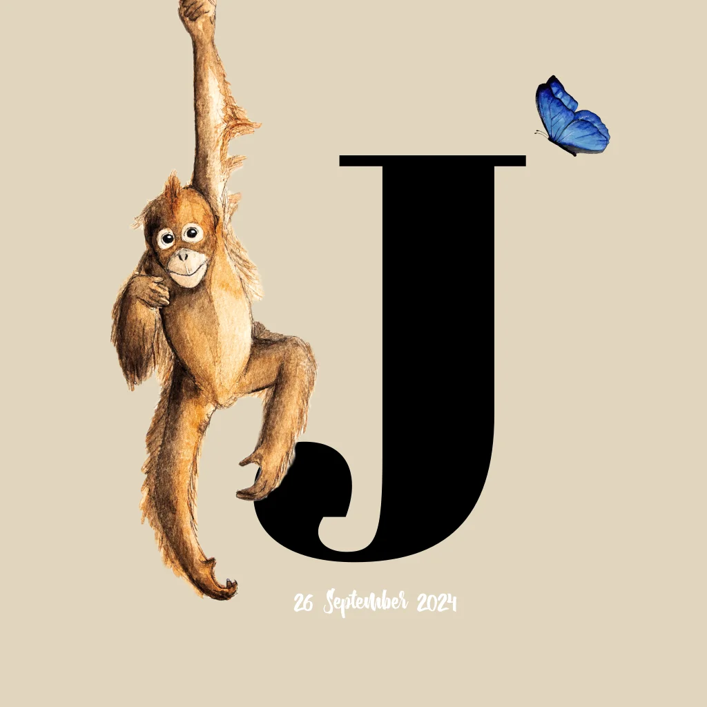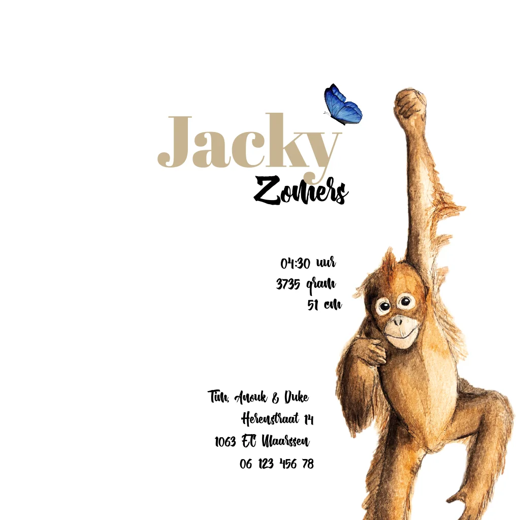 Lief hangend aapje, met de hand getekend en afgewerkt met aquarel. Maak van dit geboortekaartje door verschillende kleuren en lettertypes er je eigen ontwerp van.