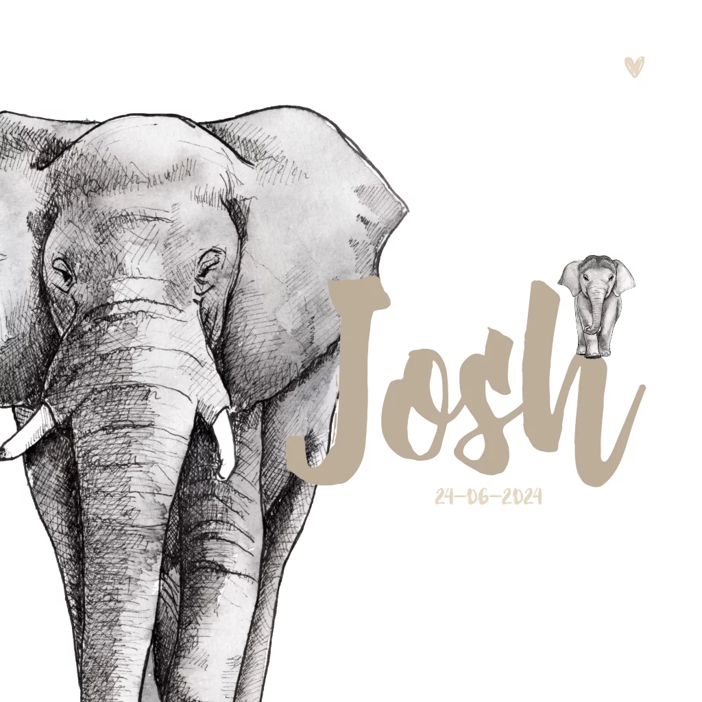 Stoere olifant met baby olifant, met de hand getekend en afgewerkt met aquarel. Maak van dit geboortekaartje door verschillende kleuren en lettertypes er je eigen ontwerp van.