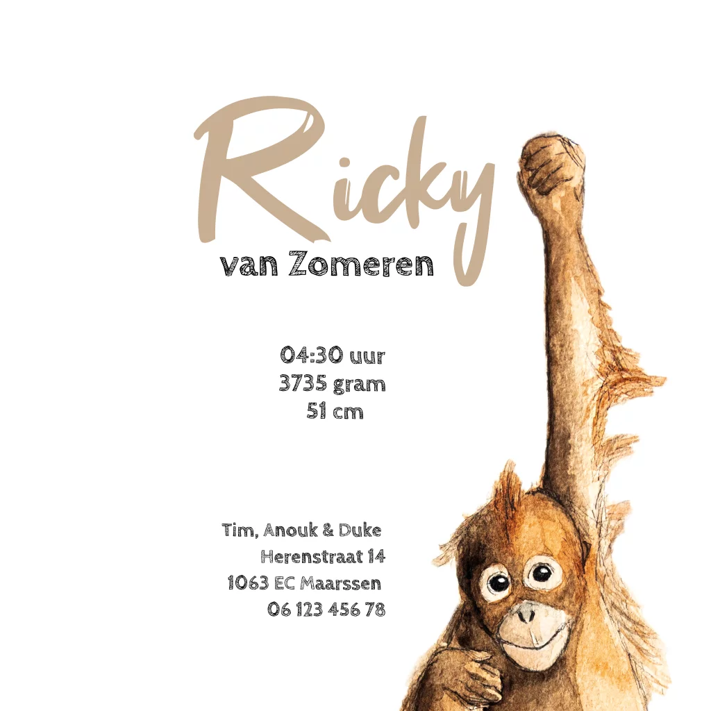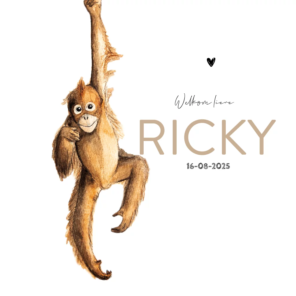 Lief hangend aapje, met de hand getekend en afgewerkt met aquarel. Maak van dit geboortekaartje door verschillende kleuren en lettertypes er je eigen ontwerp van.