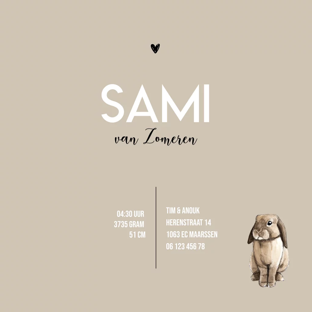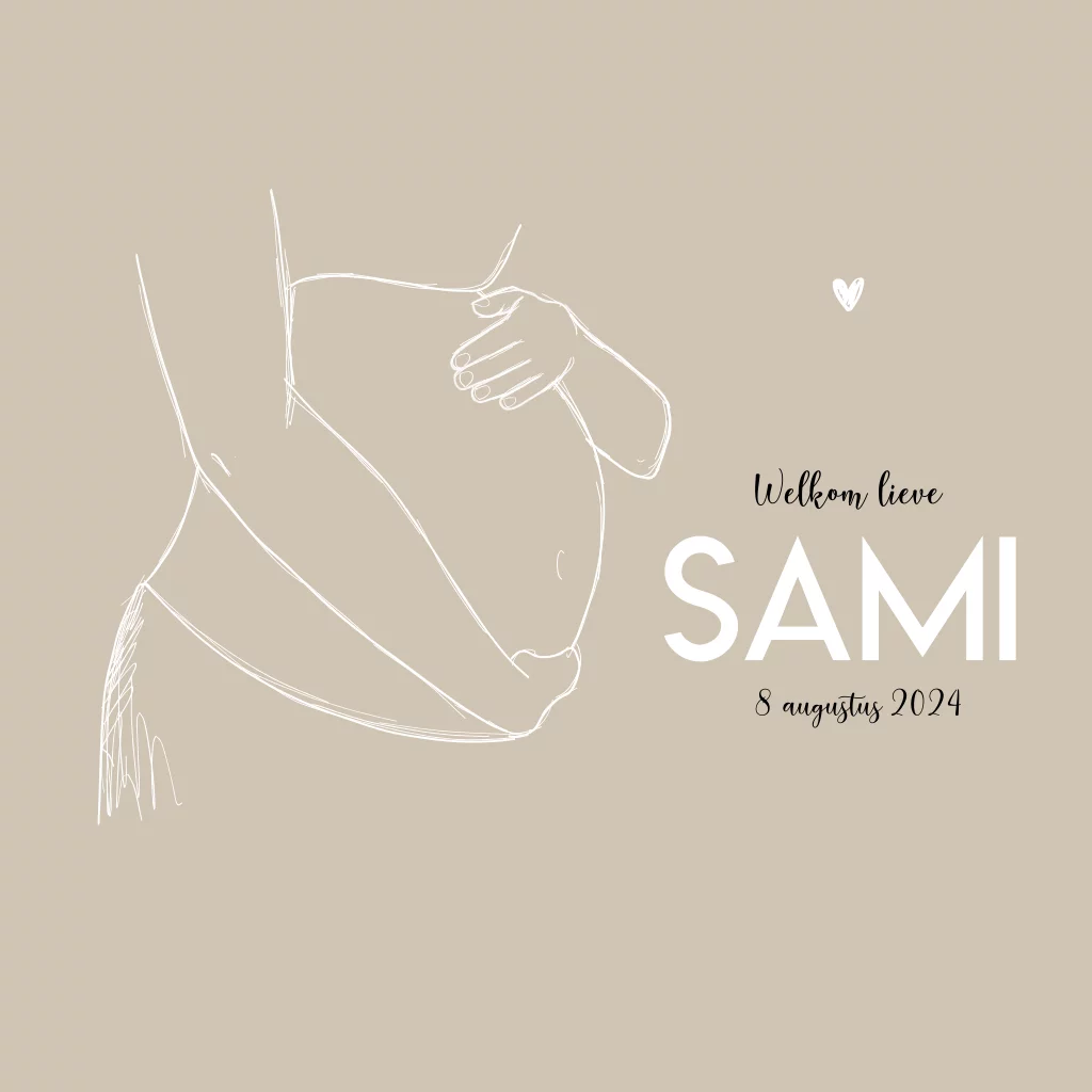 Staand vierkant geboortekaartje met een illustratie van een zwangere buik getekend door BINTJE. Dit kaartje kan je helemaal zelf aanpassen naar eigen wens.