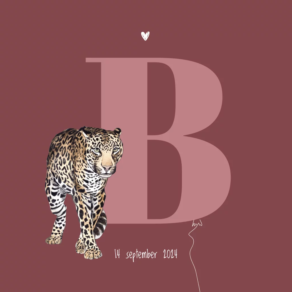Stoere luipaard, met de hand getekend en afgewerkt met aquarel. Maak van dit geboortekaartje door verschillende kleuren en lettertypes er je eigen ontwerp van.