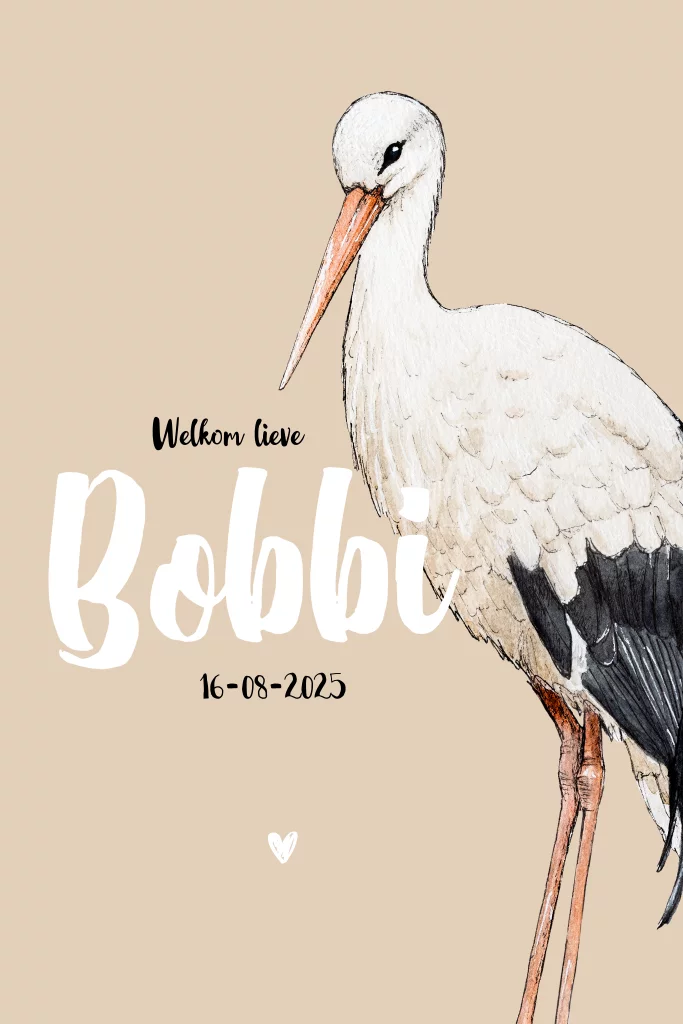 Ooievaar, met de hand getekend en afgewerkt met aquarel. Maak van dit geboortekaartje door verschillende kleuren en lettertypes er je eigen ontwerp van.