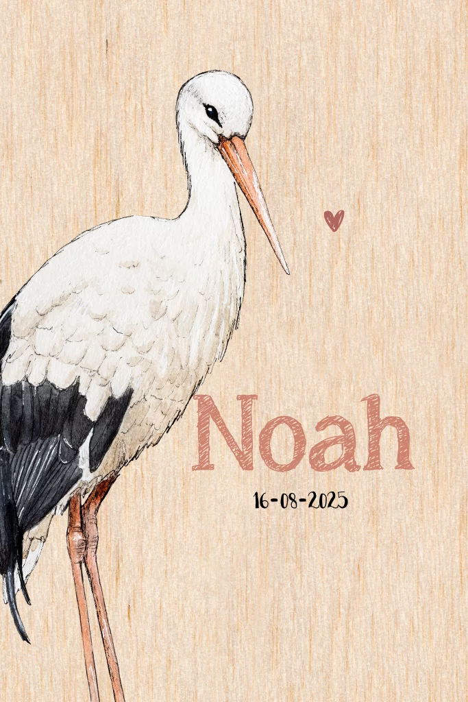 Geboortekaartje hout met ooievaar, met de hand getekend en afgewerkt met aquarel. Maak van dit geboortekaartje door verschillende kleuren en lettertypes er je eigen ontwerp van.