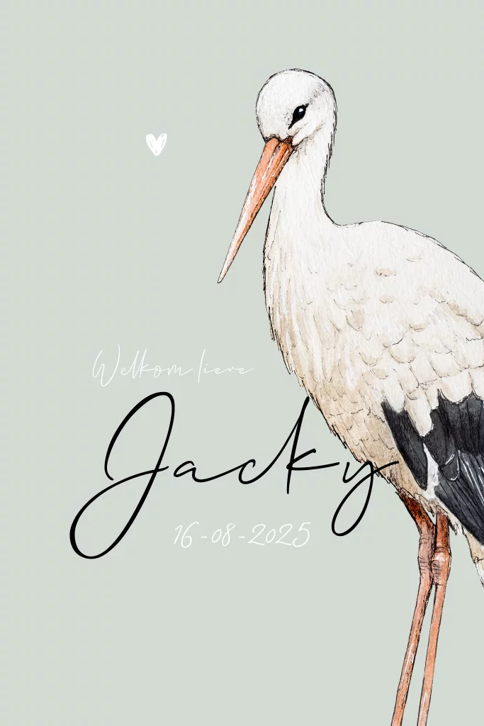 Neutraal geboortekaartje met ooievaar, met de hand getekend en afgewerkt met aquarel. Maak van dit geboortekaartje door verschillende kleuren en lettertypes er je eigen ontwerp van.