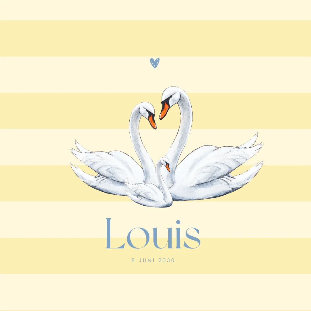 Hoe schattig is dit geboortekaartje met zwaantjes in butter yellow. Makkelijk zelf aan te passen in de editor.