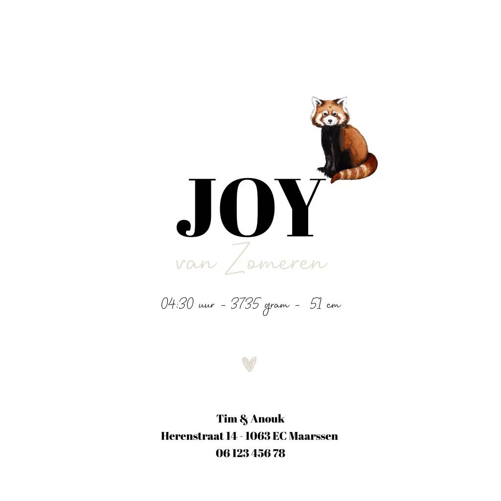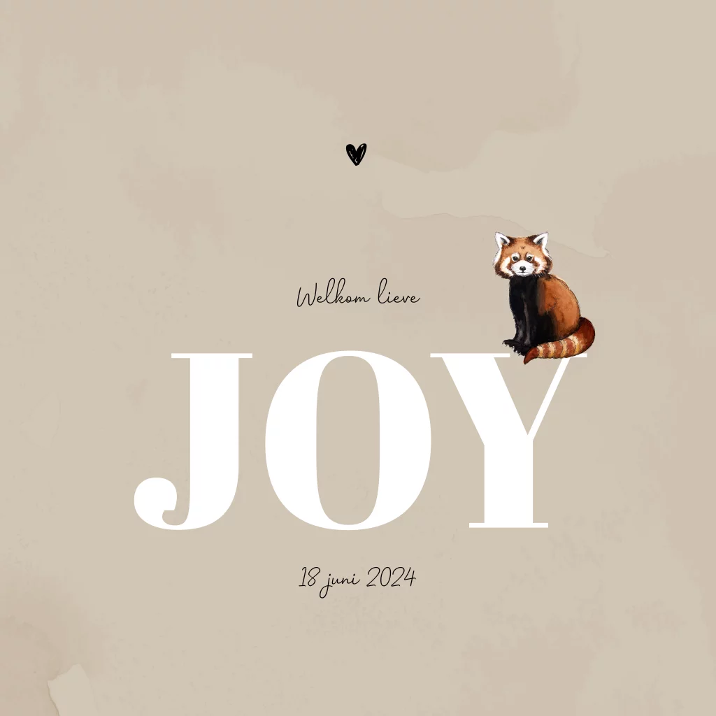 Vierkant geboortekaartje met een illustratie van de rode panda, getekend door BINTJE. Dit kaartje is helemaal zelf aanpassen in de editor. Maak met andere kleuren, lettertypes of een ander diertje er je eigen geboortekaartje van.
