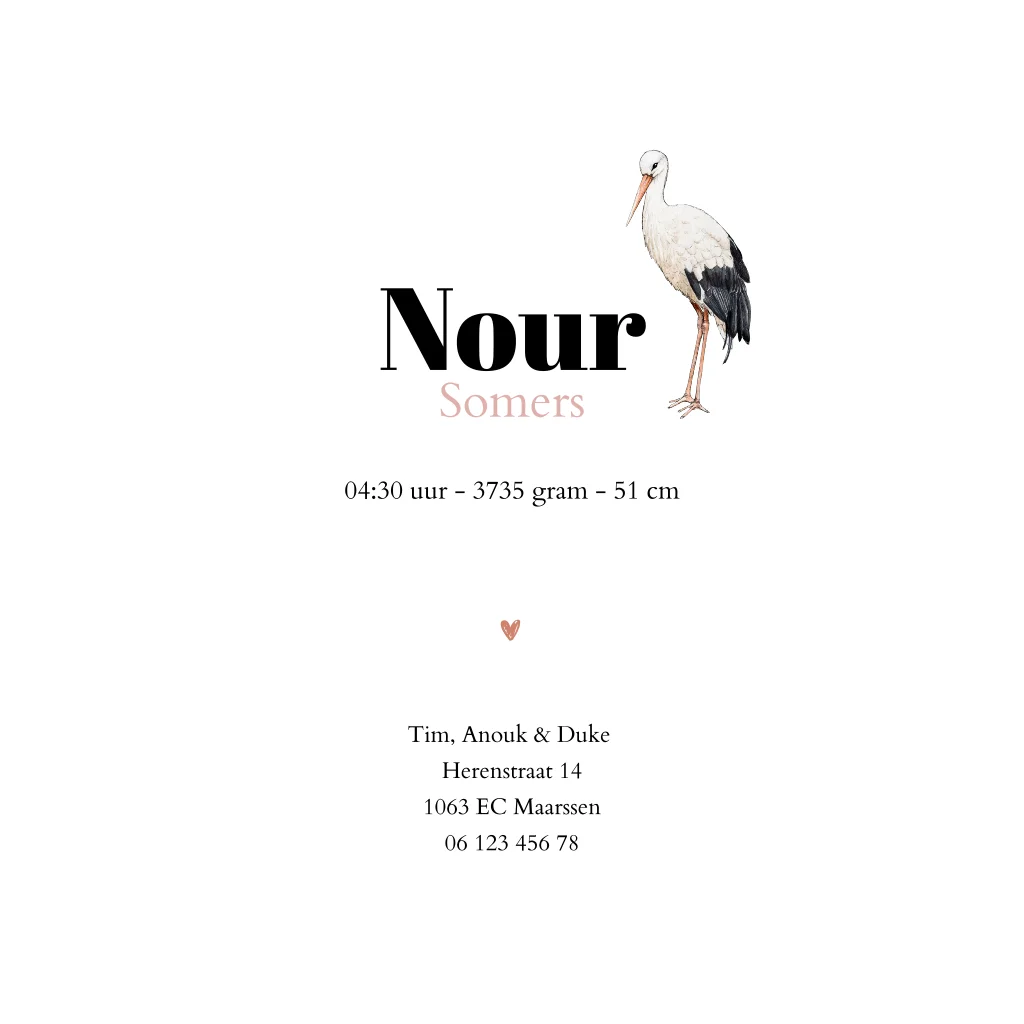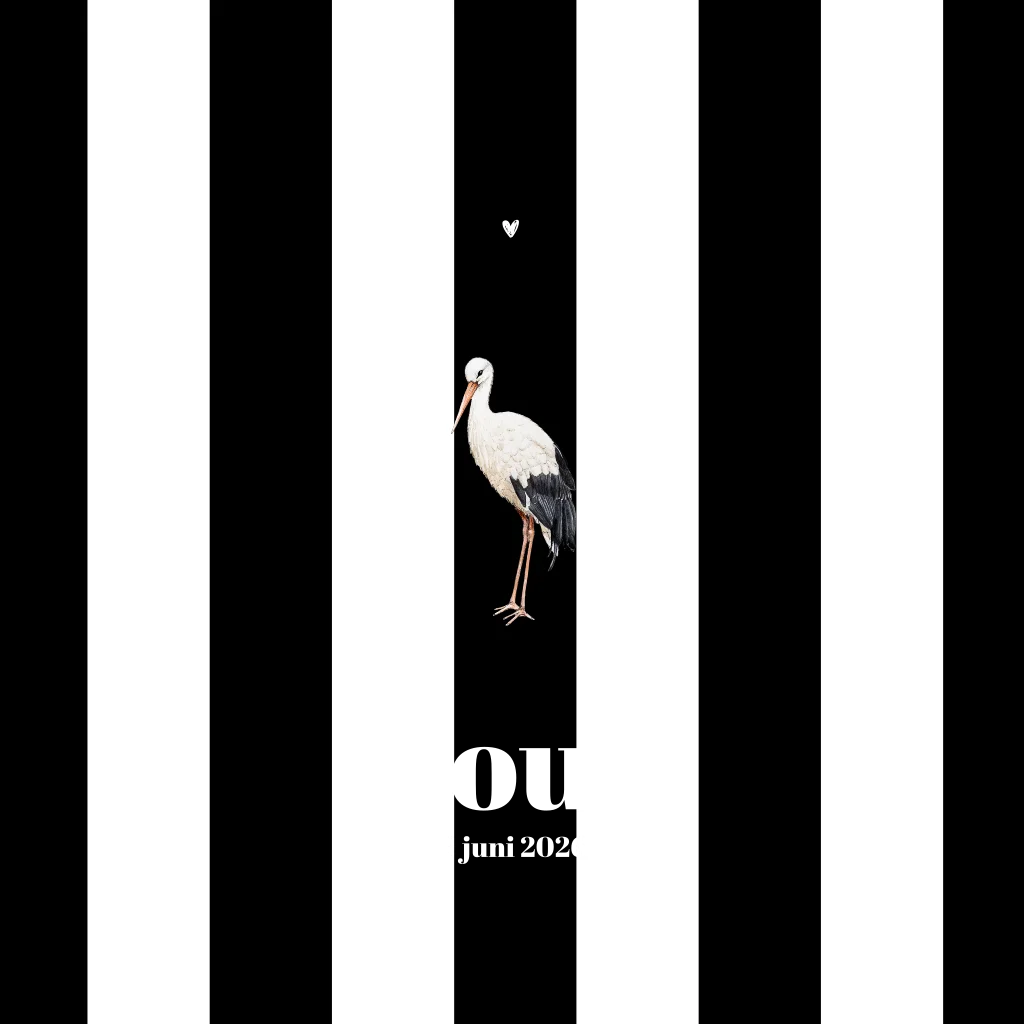 Hoe leuk is dit geboortekaartje met een hippe zwart wit strepen en ooievaar. Je kan dit geboortekaartje zelf aanpassen. Ander diertje, ander kleurtje, ander lettertype? Geen probleem, je past hem helemaal aan naar je eigen wensen.