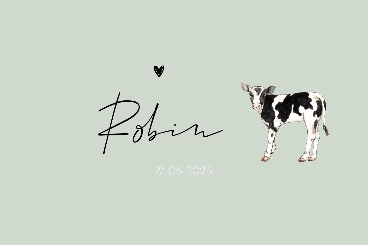 Geboortekaartje neutraal met een schattige baby koe, met de hand getekend en afgewerkt met aquarel. Maak van dit groene geboortekaartje met een ronde hoeken, met verschillende kleuren en lettertypes er je eigen geboortekaartje van.