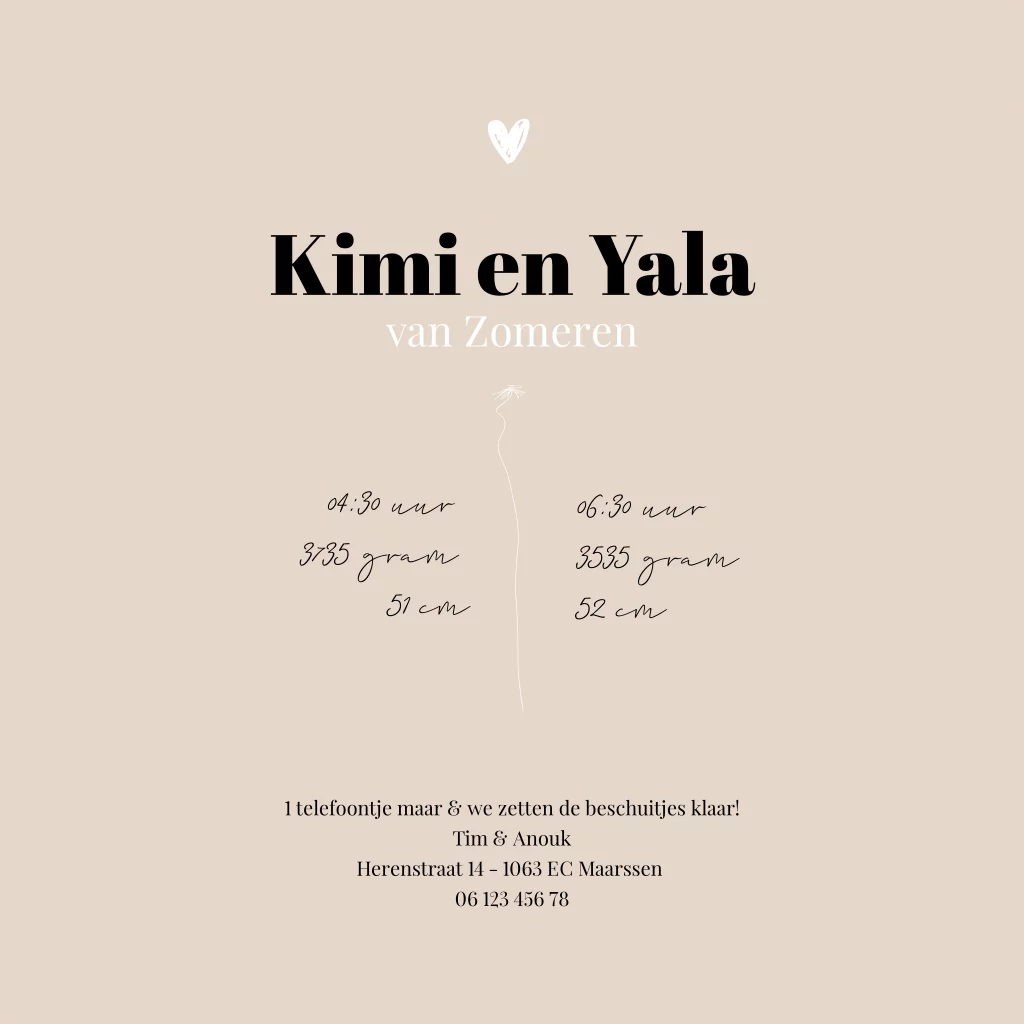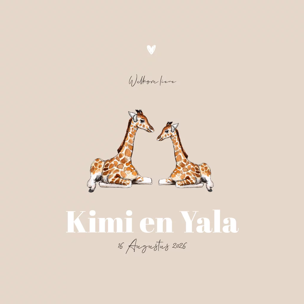 Geboortekaartje met tweeling girafjes, met de hand getekend en afgewerkt met aquarel. Maak van dit geboortekaartje, met verschillende kleuren en lettertypes er je eigen geboortekaartje van.