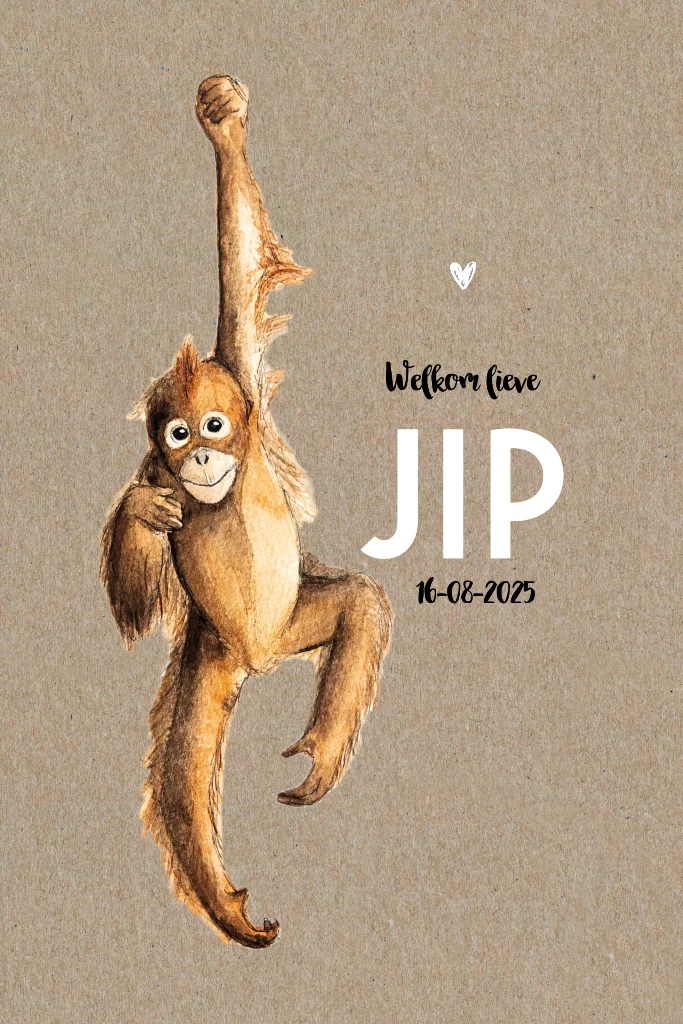 Stoere hangend aapje, met de hand getekend en afgewerkt met aquarel. Maak van dit geboortekaartje door verschillende kleuren en lettertypes er je eigen ontwerp van.