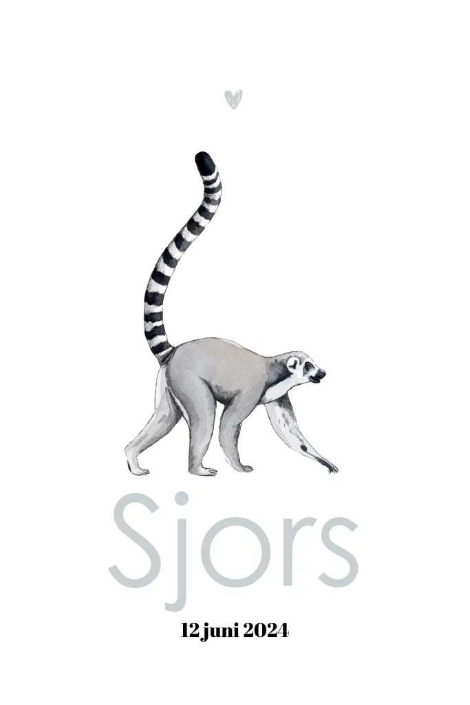 Stoere maki, met de hand getekend en afgewerkt met aquarel. Maak van dit geboortekaartje door verschillende kleuren en lettertypes er je eigen ontwerp van.