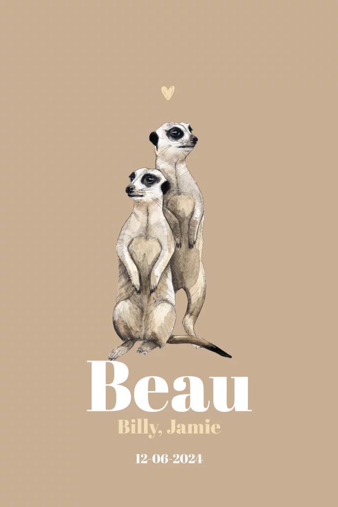 Schattige Stokstaartjes, met de hand getekend en afgewerkt met aquarel. Maak van dit geboortekaartje door verschillende kleuren en lettertypes er je eigen ontwerp van.