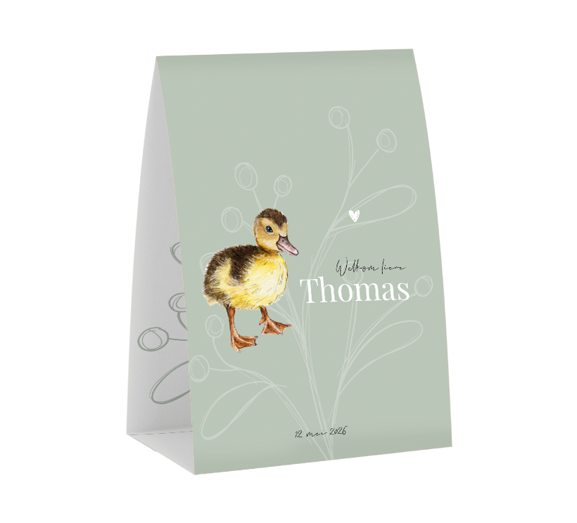 Hoe bijzonder is dit tentkaartje? Dit kaartje kan je gemakkelijk in elkaar zetten en heeft een schattige illustratie een schattig baby eendje. Dit kaartje is helemaal zelf aanpassen in de editor. Maak met andere kleuren, lettertypes of een ander diertje er je eigen geboortekaartje van.