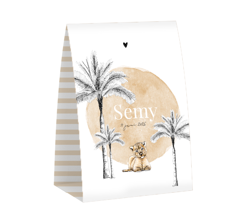 Hoe bijzonder is dit tentkaartje? Dit kaartje kan je gemakkelijk in elkaar zetten en heeft een schattige illustratie van de baby leeuw met palmbomen, echt een zomers geboortekaartje. Aan de binnenkant streepjes, getekend door BINTJE. Dit kaartje is helemaal zelf aanpassen in de editor. Maak met andere kleuren, lettertypes of een ander diertje er je eigen geboortekaartje van.